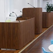 SIDA Objekt: SIDA Arkitekt: Brunnberg & Forshed/Tengbom Fakta: Talarstolar och auditoriemöbler i valnöt, kaffestationer i ek, kulörmålade datamöbler, receptionsdisk i mörkbetsad ek och bänkskiva i kompaktlaminat.