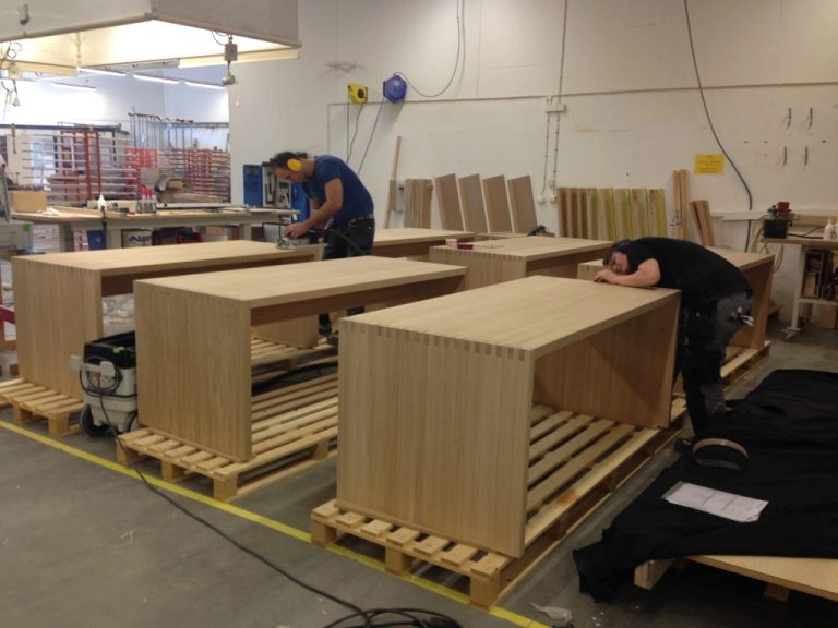 Restaurangbord, ståbord och sittbänkar i massiv ek med fingerskarvade hörn tar form i produktionen