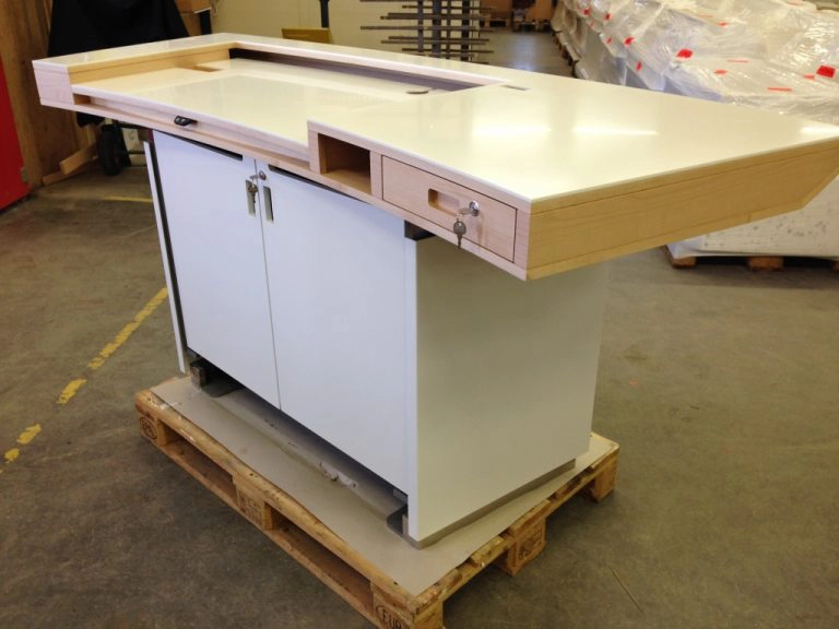 Höj- och sänkbar receptionsdisk Av Pia Hansson | Publicerat 23 januari, 2014 Höj- och sänkbar receptionsdisk i lönn och toppskiva i vit Staron® klar för packning och leverans. Dela inlägg