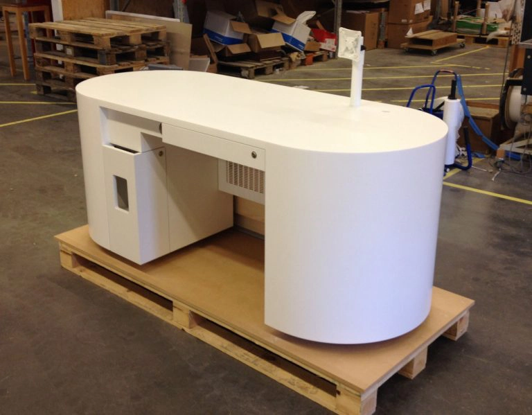 Leverans till New York Av Pia Hansson | Publicerat 29 april, 2014 Höj – och sänkbart skrivbord med ett yttre “skal” i kompositmaterialet Corian och asklaminat mot golv, levereras just nu till Ericsson New York Dela inlägg