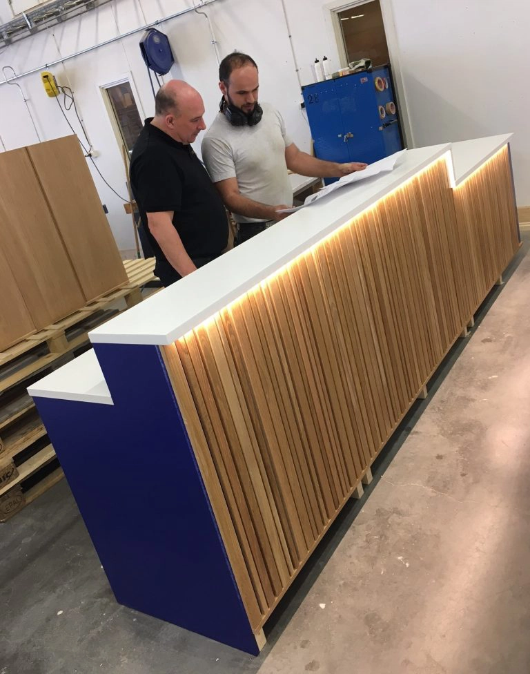 Receptionsdisk klädd i ekribbor och infälld ledbelysning