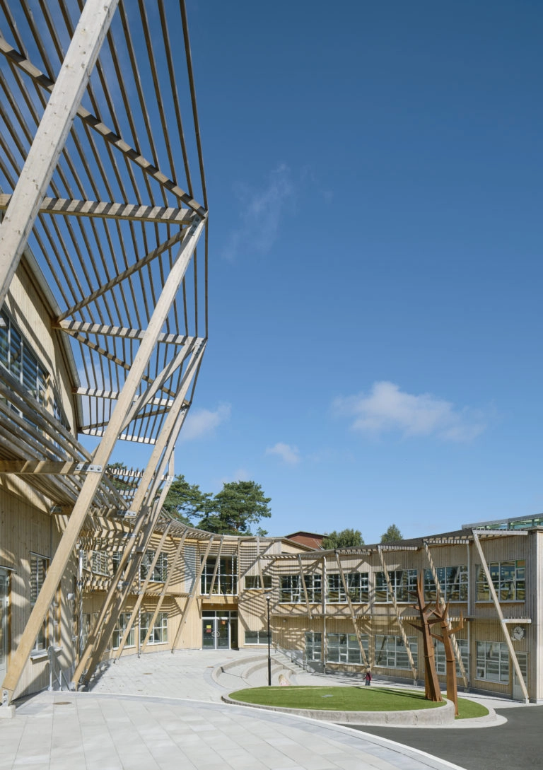 matsal och storkök samt idrottshall. Byggnadens exteriör med obehandlad värmebehandlad thermowood av furu och gröna sedumtak speglar även interiören – där björkplywood och industriparkett är tongivande.