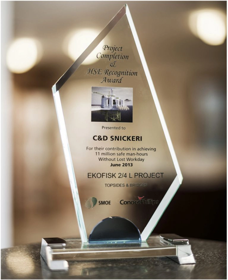 Som ett resultat av vårt arbete med offshoreprojektet SMOE – den senaste plattformen till det norska EKOFISK-området, har vi nu mottagit HSE RECOGNITION AWARD. Utmärkelsen avser hela SMOE-projektet och syftet är att främja hälsa, säkerhet och miljöfrågor på arbetsplatsen. Det gigantiska projektet som sammanlagt omfattar över 11 miljoner arbetstimmar utförda av projektets deltagare har skett på ett säkert sätt och bland annat inte inneburit en enda inställd arbetsdag på grund av säkerhetsproblem eller olyckor. C&D Snickeris del av projektet har inneburit ca 15.000 arbetstimmar fördelat på projektledning, produktion och montage.