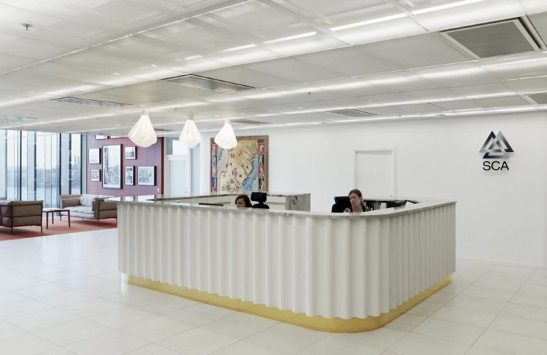 C&D Snickeri har på uppdrag av inredningsföretaget AB Evert Lindelöf tillverkat och levererat snickerier till SCAs nya huvudkontor. Inredningarna består av reception, möbelväggar, buffémöbel, kappnisch, bord och blomlådor. Snickerierna går i naturliga kulörer och är bland annat utformade i spännande vågmönster där man har integrerat marmorsten, teak och mässing för att höja den exklusiva känslan. Bakom formen står Ida Wanler på Sandell Sandberg.