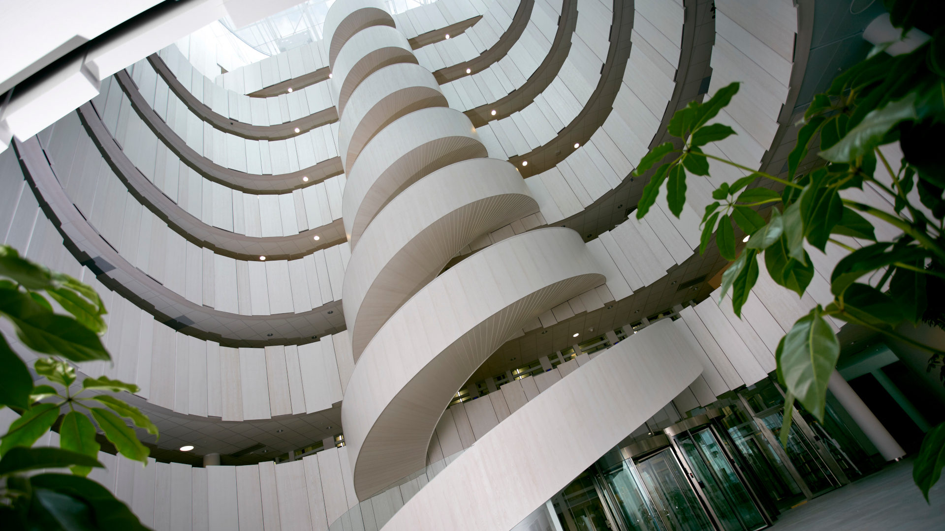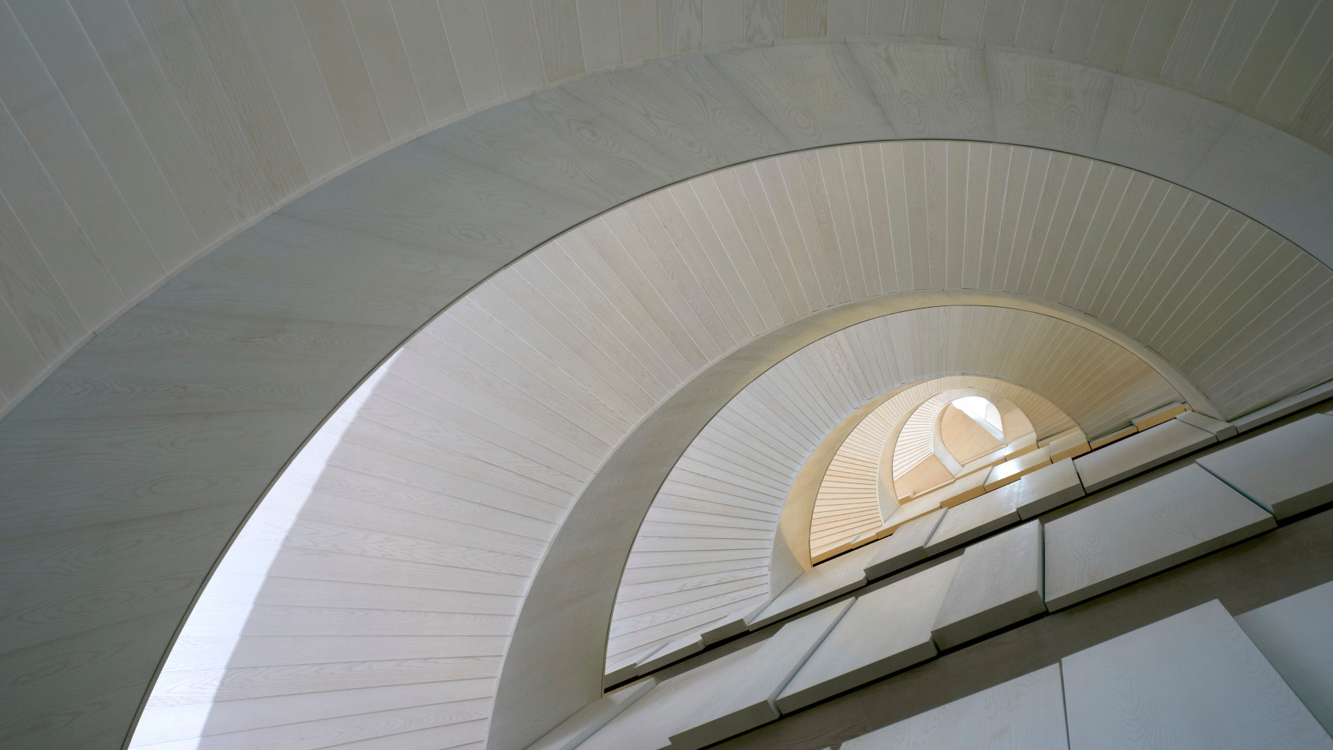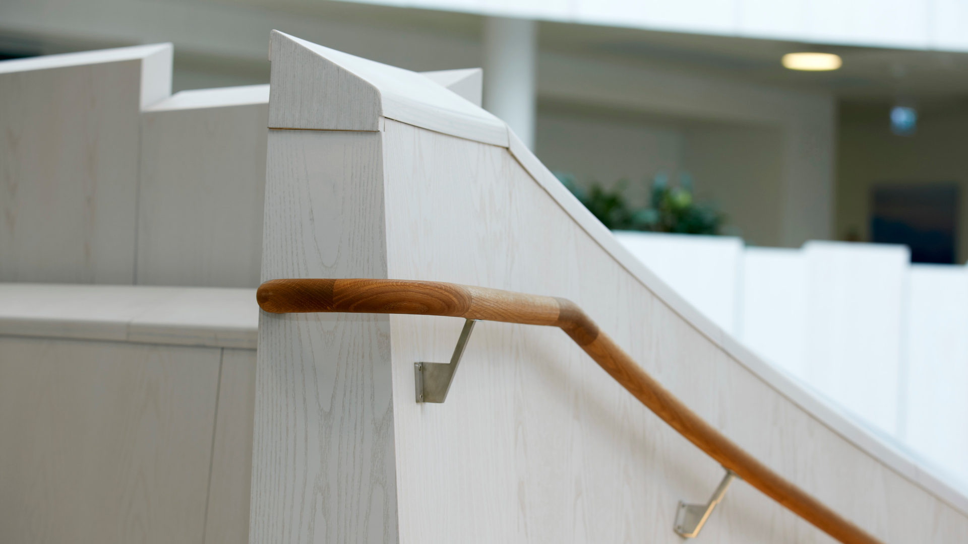 Fakta: Inklädnad spiraltrapp, våningsbjälklag, överliggare/frontpaneler i vitlaserad ask i olika densitet. Steg och ledstänger i oljad ek.