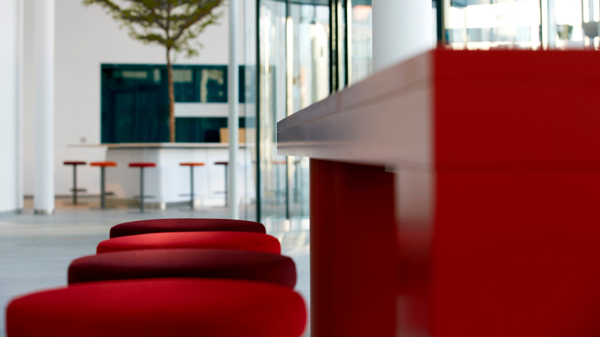 Fakta: Coffee/Sideboard i lounge, sideboard med bagageförvaring, self-incheck-bord (med träd) i receptionen, internetbord i paviljong, bord i lounge, orangeri, coffee area och matsal, höga teamtable-bord och konferensbord, sittmöbler i paviljong, talarpulpet i auditorium.Övervägande inredning tillverkat i ask med svagt vitpigmenterad klarlack.