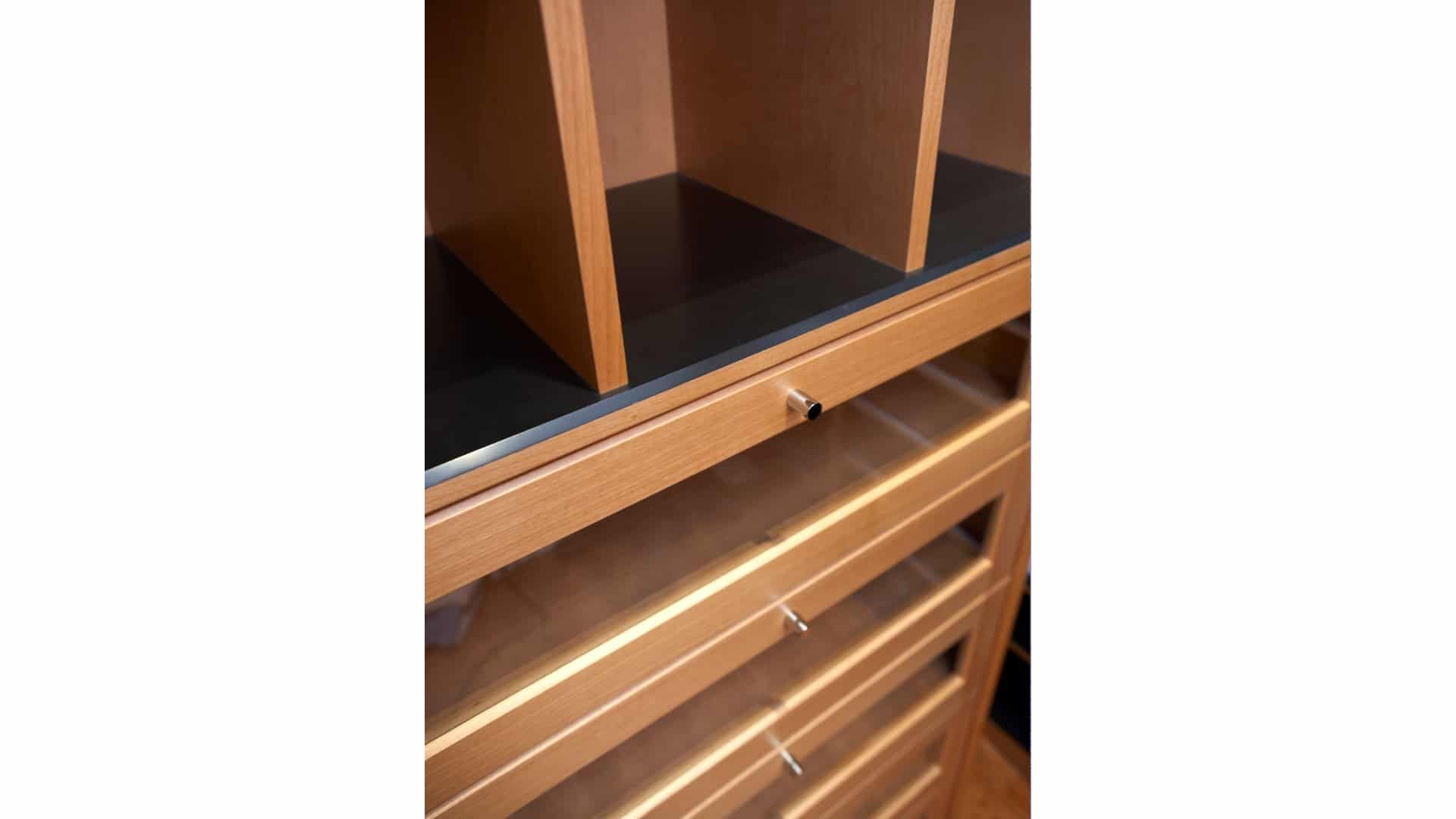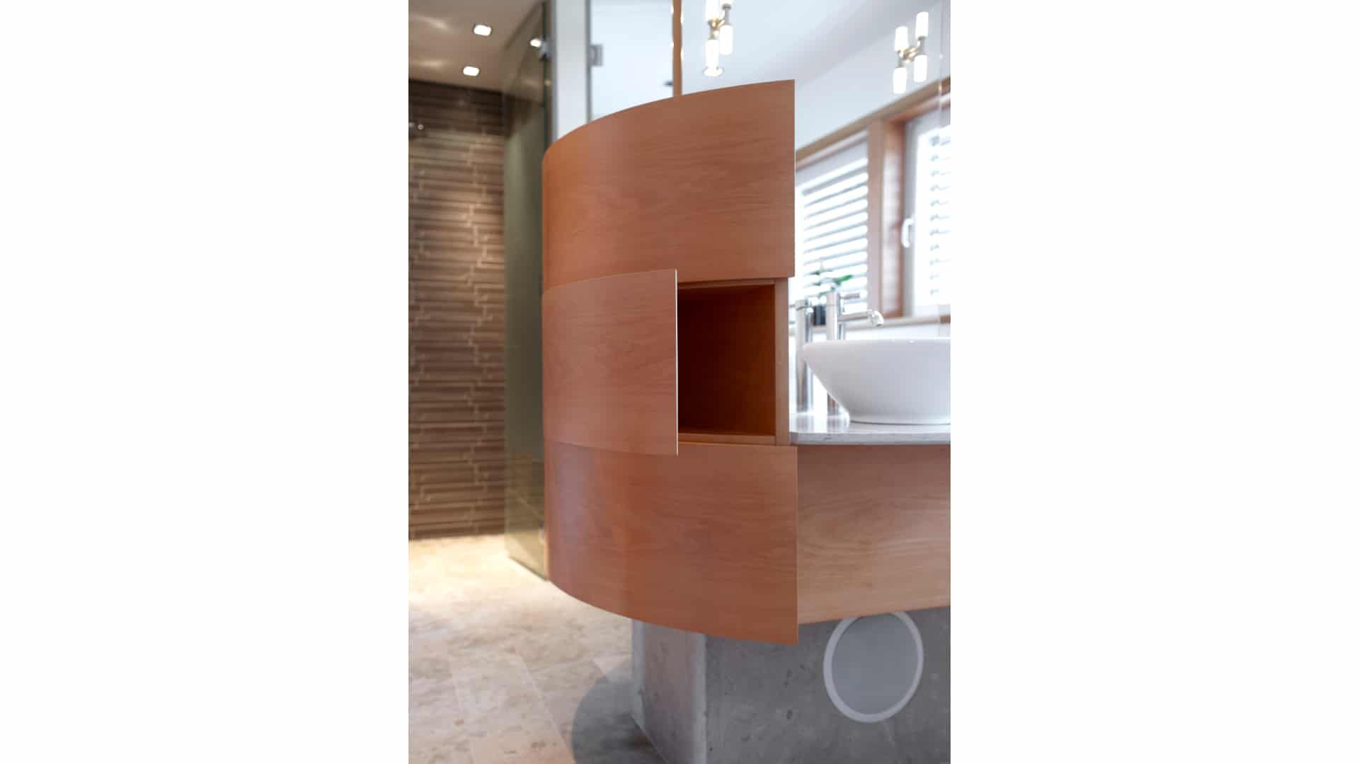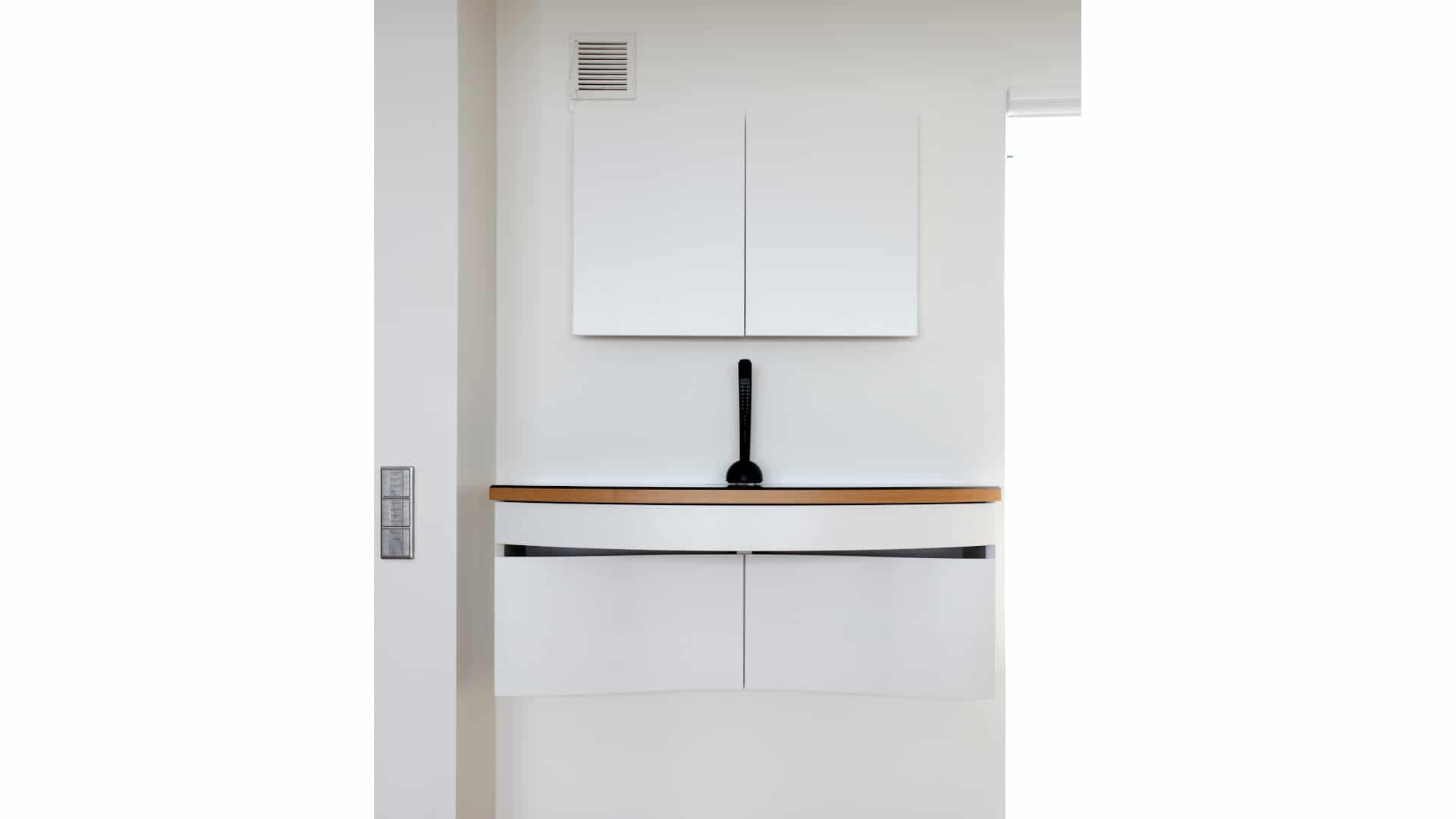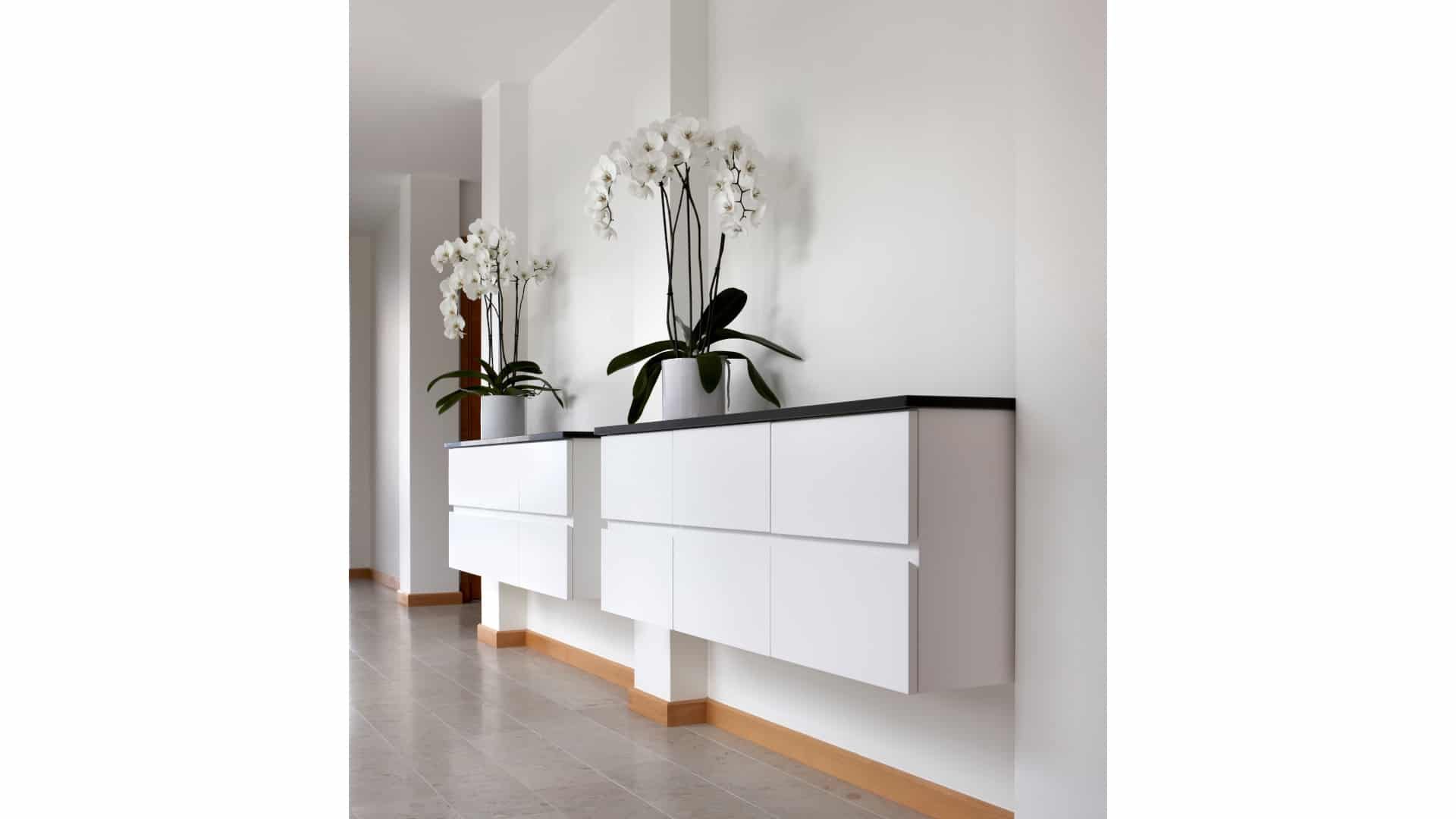 Fakta: Interiör i privatboende med kök, klädvårdsrum, bibliotek, skrivbord och badrum i svensk al, bänkskivor i Nero Assoluto-sten. Kulörmålade förvaringsskåp, hyllplan till biblioteksinredningen i Corian®. Innerdörrar och entrédörrar i svensk al, utsidans entrédörrar kulörmålade i epoxi högblanksfärg.