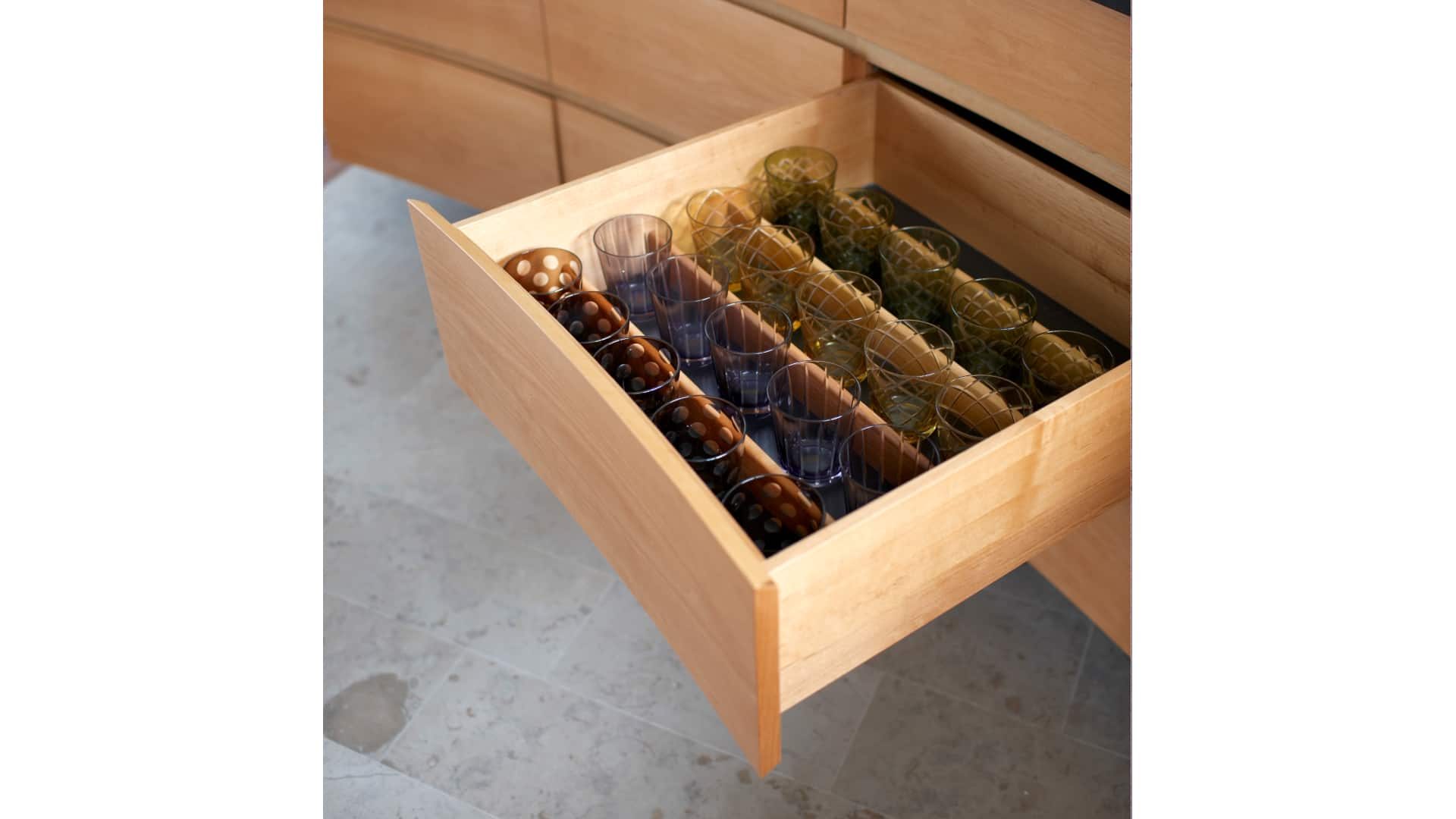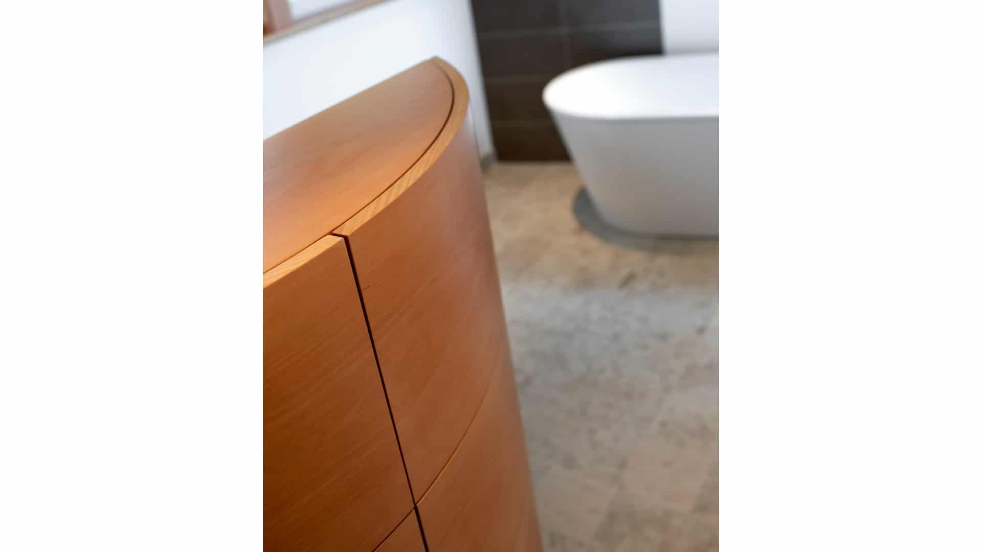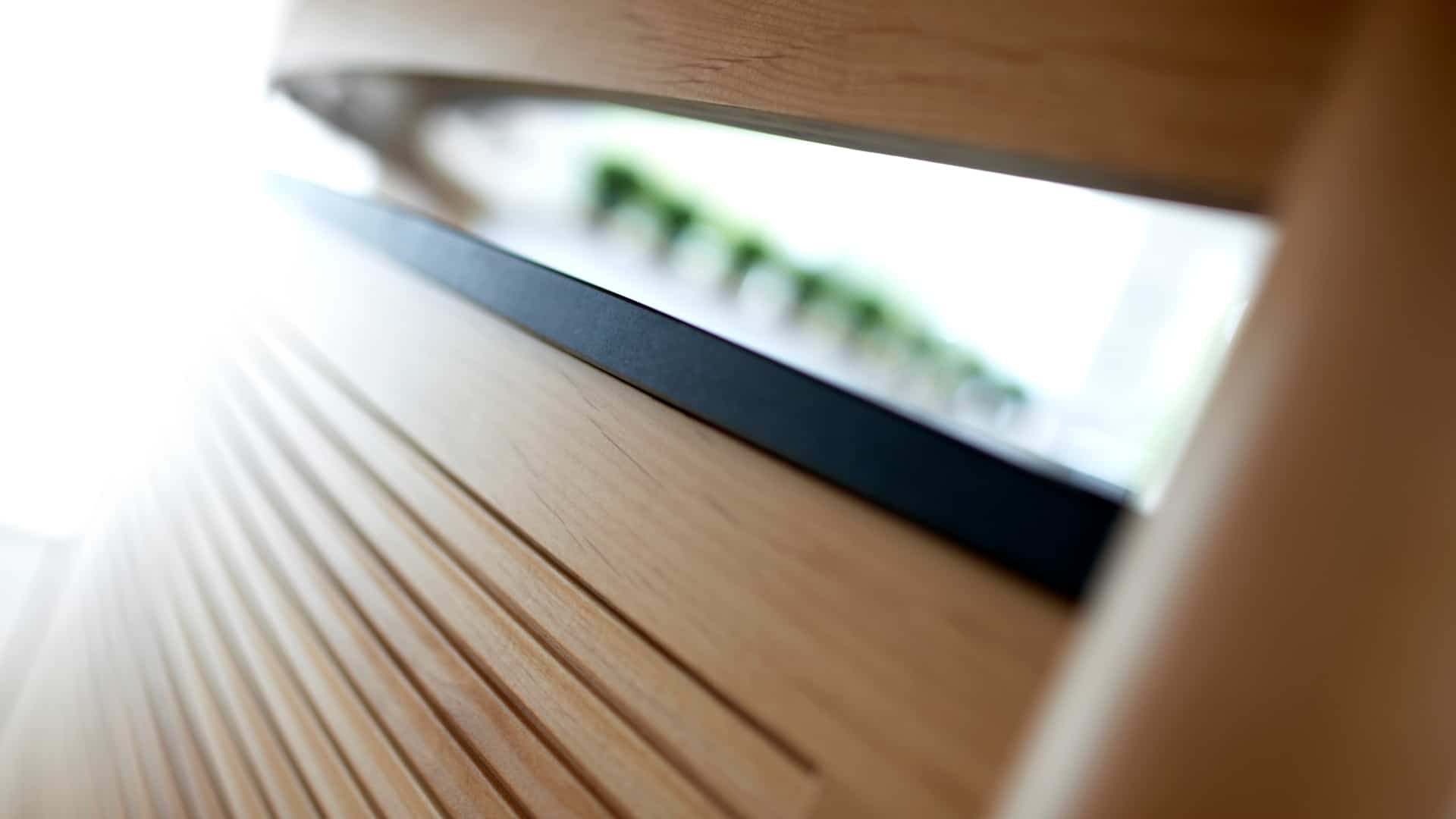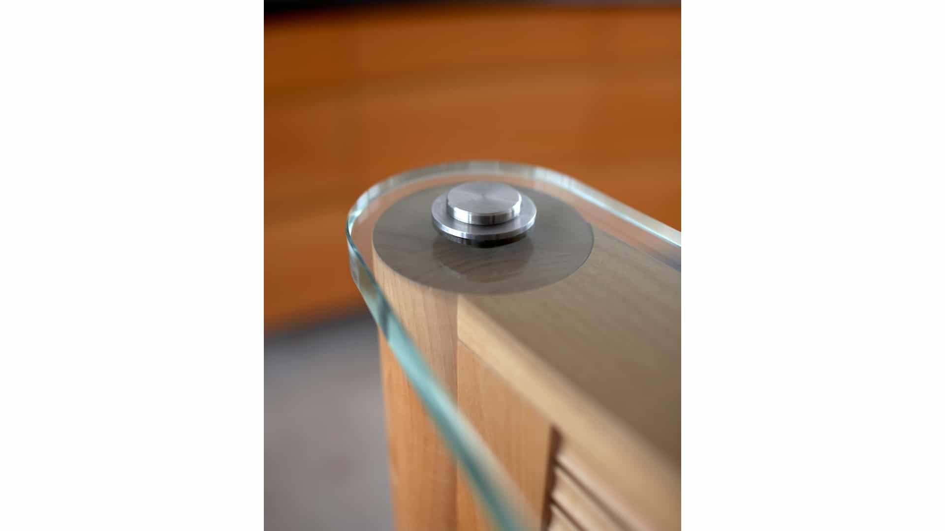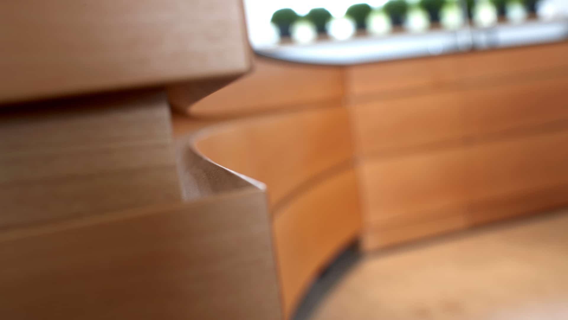 Fakta: Interiör i privatboende med kök, klädvårdsrum, bibliotek, skrivbord och badrum i svensk al, bänkskivor i Nero Assoluto-sten. Kulörmålade förvaringsskåp, hyllplan till biblioteksinredningen i Corian®. Innerdörrar och entrédörrar i svensk al, utsidans entrédörrar kulörmålade i epoxi högblanksfärg.